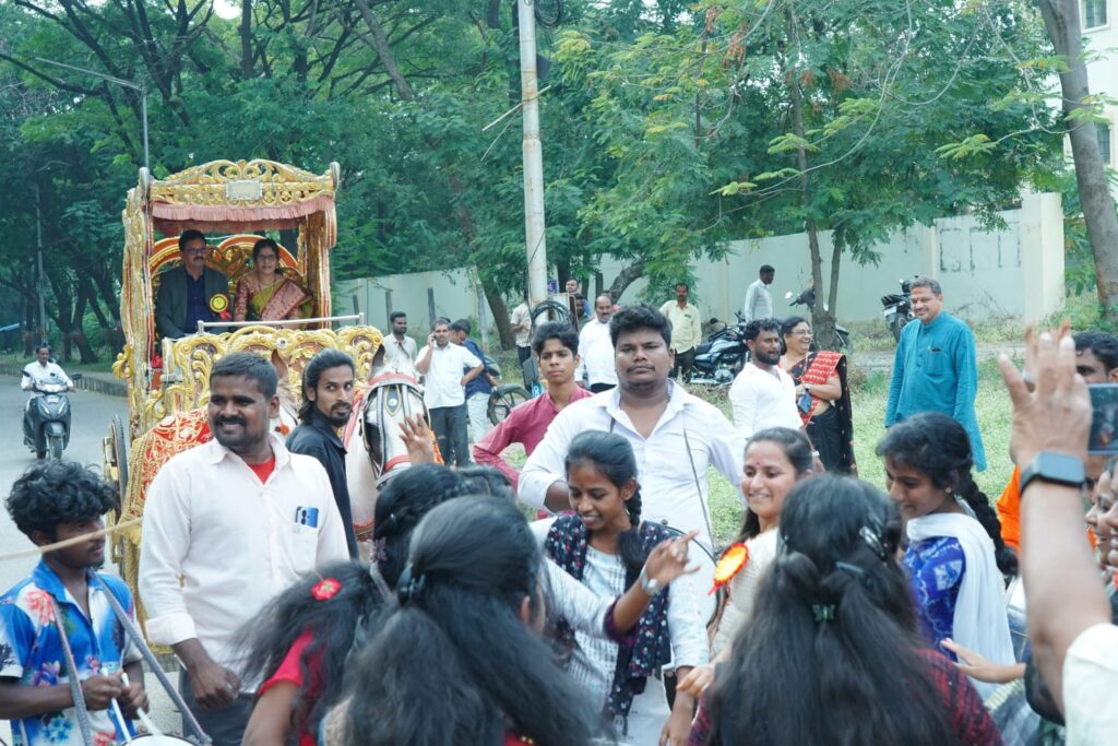 వరంగల్ జోర్థార్ ప్రతినిధి: శిష్యుల అభిమానం తమకు పాఠాలు చెప్పిన గురువుపై పూలవానై కురిసింది. తమకు పీజీలో పాఠాలు చెప్పిన, ఎంఫిల్, పీహెచ్డీ లో గైడ్ చేసిన ప్రొఫెసర్ ను ఉద్యోగ విరమణ సందర్భంగా వినూత్న రీతిలో వీడ్కోలు పలికారు. గుర్రపు బగ్గ ఊరేగించి గురుభక్తి చాటుకున్నారు. కాకతీయ యూనివర్శిటీ సోషియాలజీ అండ్ సోషల్ వర్క్ విభాగంలో ప్రొఫెసర్ తౌటం శ్రీనివాస్ రిటైర్మెంట్ సందర్భంగా శుక్రవారం ఈ సన్నివేశం చోటుచేసుకుంది. ప్రొఫెసర్ శ్రీనివాస్ విద్యార్థులతో పాటు యూనివర్శిటీలోని తోటి అధ్యాపకులతో ఆప్యాయంగా ఉంటూ అందరి మన్ననలు పొందారు.ఉద్యోగ విరమణ సందర్భంగా శ్రీనివాస్, లక్ష్మీప్రసన్న దంపతులను ఆయన శిష్యులు గుర్రపు బగ్గీపై యూనివర్సిటీ లో ఊరేగించారు. అడుగడుగునా వారిపై పూల వర్షం కురిపించారు. విద్యార్థులు అడి పాడారు.