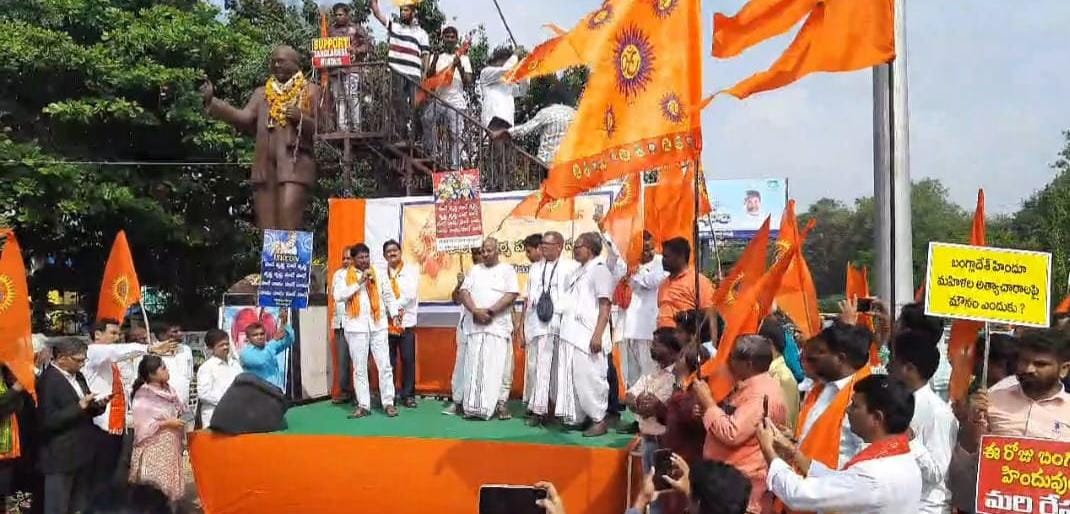 హిందూ ధర్మ పరిరిక్షణ సమితి బాధ్యులు వెలగందుల రాజు, డా మంద శ్రీనివాస్ లు, జూలపల్లి కరుణాకర్ లు మాట్లాడుతూ బంగ్లాదేశ్ లో ఇస్కాన్ సభ్యులతో సహా 19 మంది హిందువులపై దేశద్రోహం కేసు నమోదైంది. బాధితుల్లో ఇస్కాన్ డివిజనల్ ఆర్గనైజేషన్ సెక్రటరీ చందన్ కుమార్ ధర్, హిందూ జాగరణ్ మంచ్ కోఆర్డినేటర్ అజయ్ దత్తా ఉన్నారని అన్నారు. కదమ్ ముబారక్ ప్రాంతంలో 6 సెప్టెంబర్ 2024న గణేశ విగ్రహాన్ని మోసుకెళ్తున్న హిందూ భక్తుల ఊరేగింపుపై దాడి జరిగిందని దాడిలో ముగ్గురు హిందువులు మరణించారని అన్నారు. బటర్గాలి ధవపర సర్వజనిన్ పూజా సమితి సభ్యులు వ్యాన్లో హిందూ దేవతా విగ్రహాన్ని తీసుకువస్తుండగా, కదమ్ ముబారక్ మసీదు సమీపంలోని ఎత్తైన భవనం పైనుంచి గణేశుడి విగ్రహంపై, హిందూ భక్తులపై వేడినీళ్లు విసిరి అల్లరి సృష్టించడం దారుణం అని అన్నారు. ఇస్కాన్ కు చెందిన సన్యాసులపై బంగ్లాదేశ్ లో జరుగుతున్న దాడులను ఖండించాల్సిన అవసరం ఉందన్నారు.
